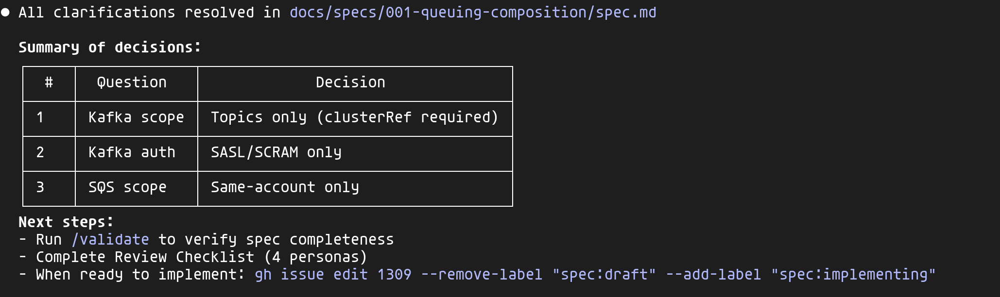 En structurant la réflexion en amont, chaque décision est documentée et justifiée avant la première ligne de code. Les quatre perspectives (PM, Platform, Security, SRE) garantissent qu'aucun angle n'est oublié, et la PR finale référence la spec : le reviewer a tout le contexte nécessaire.