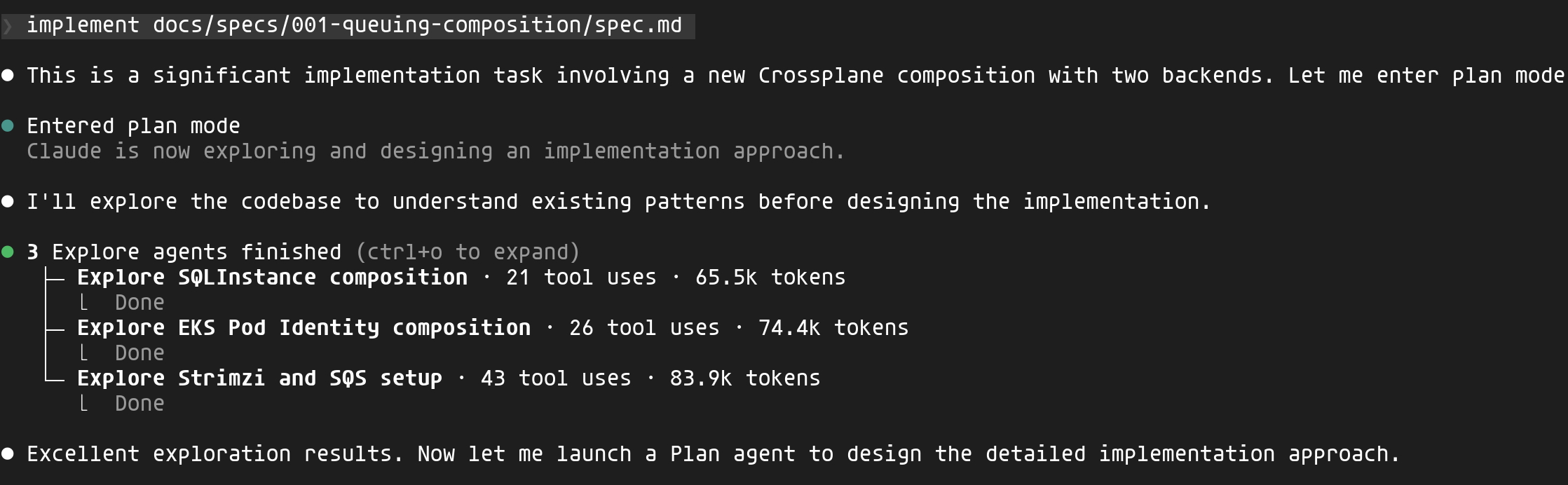 Claude explore les compositions existantes (SQLInstance, EKS Pod Identity, la configuration Strimzi) pour comprendre les conventions du projet avant d'écrire une seule ligne de code.