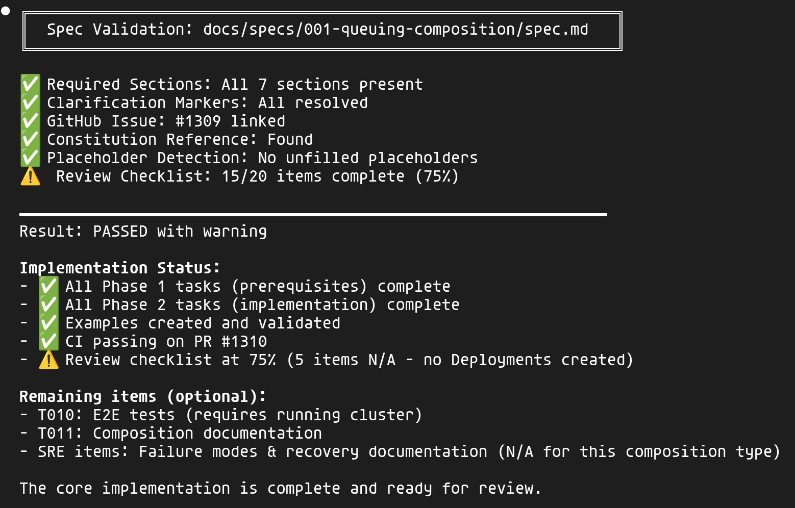 Les items "N/A" (tests E2E, documentation, failure modes) sont clairement identifiés comme optionnels pour ce type de composition.